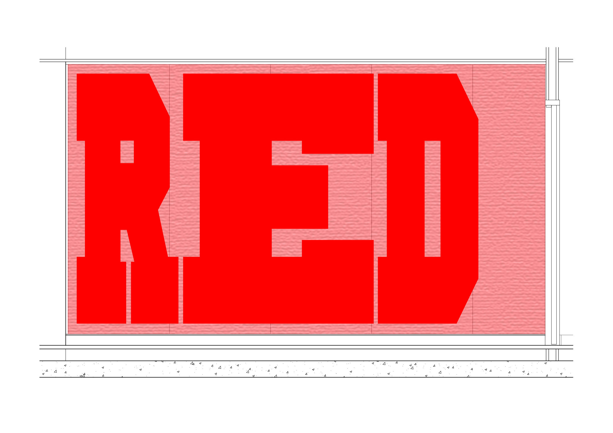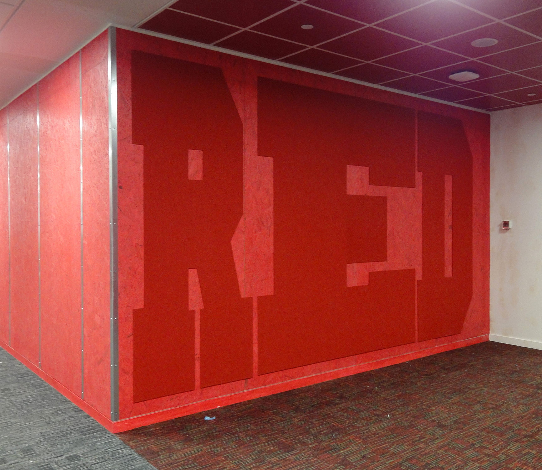 Red - finished. Note the 'packing case' wall styling, with coloured ceiling and carpet, creating a linear zone of meeting rooms and other spaces for each colour. |
