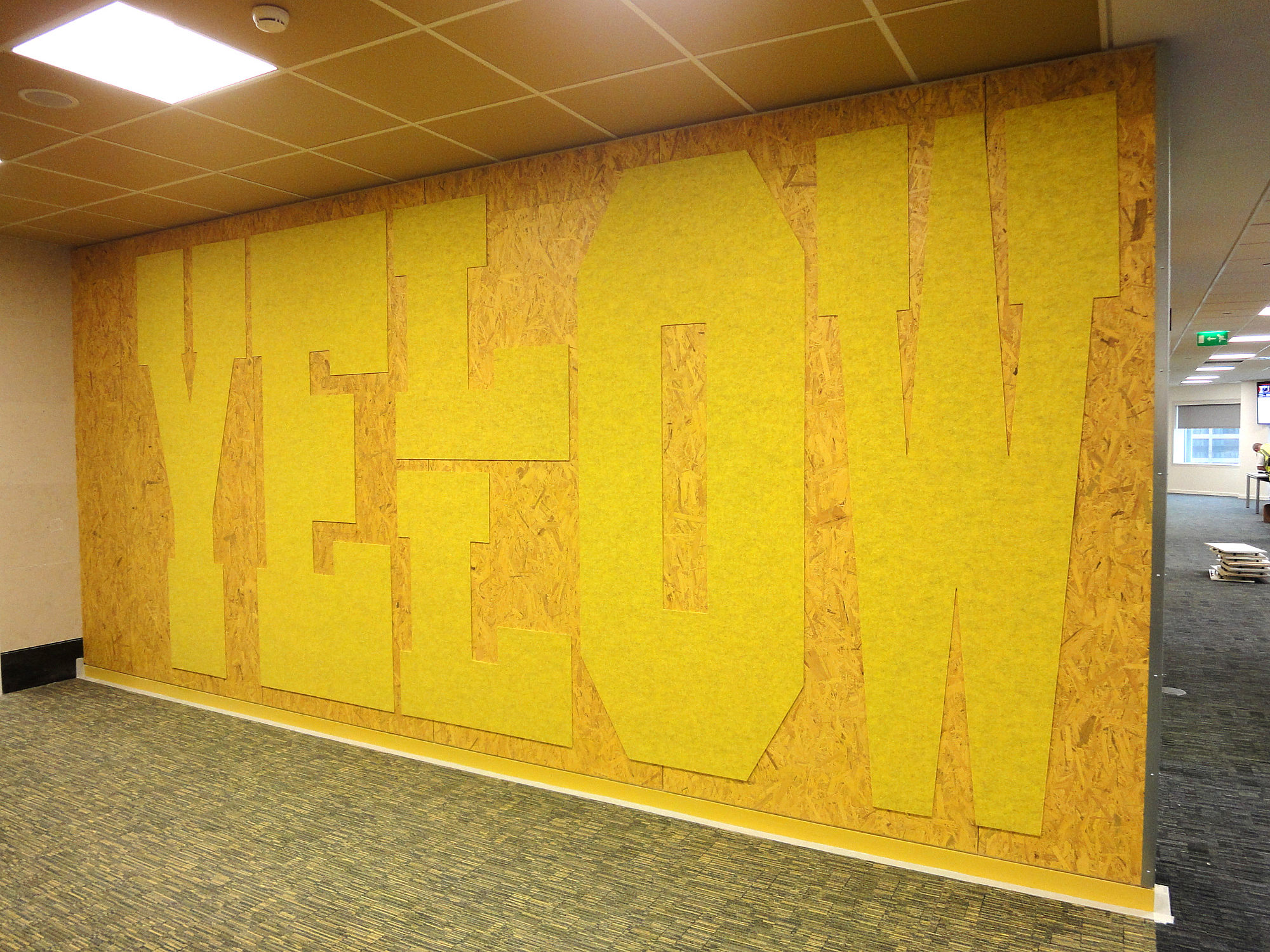 The letters are cut from polyester felt, applied to coloured OSB walls. |