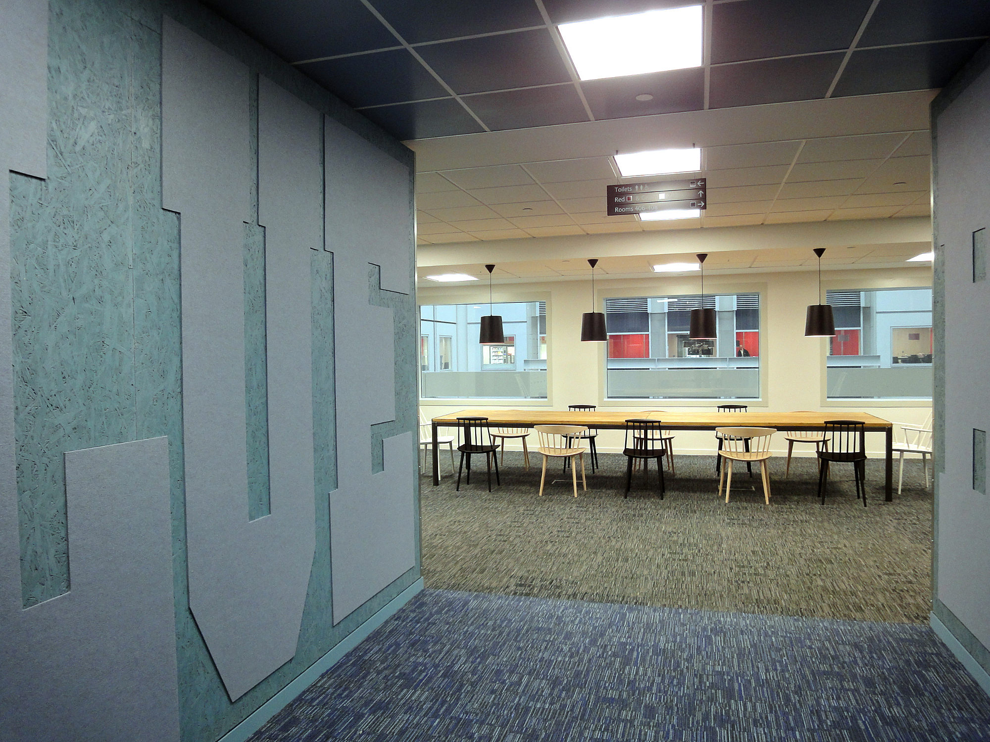 Red - finished. Note the 'packing case' wall styling, with coloured ceiling and carpet, creating a linear zone of meeting rooms and other spaces for each colour. |