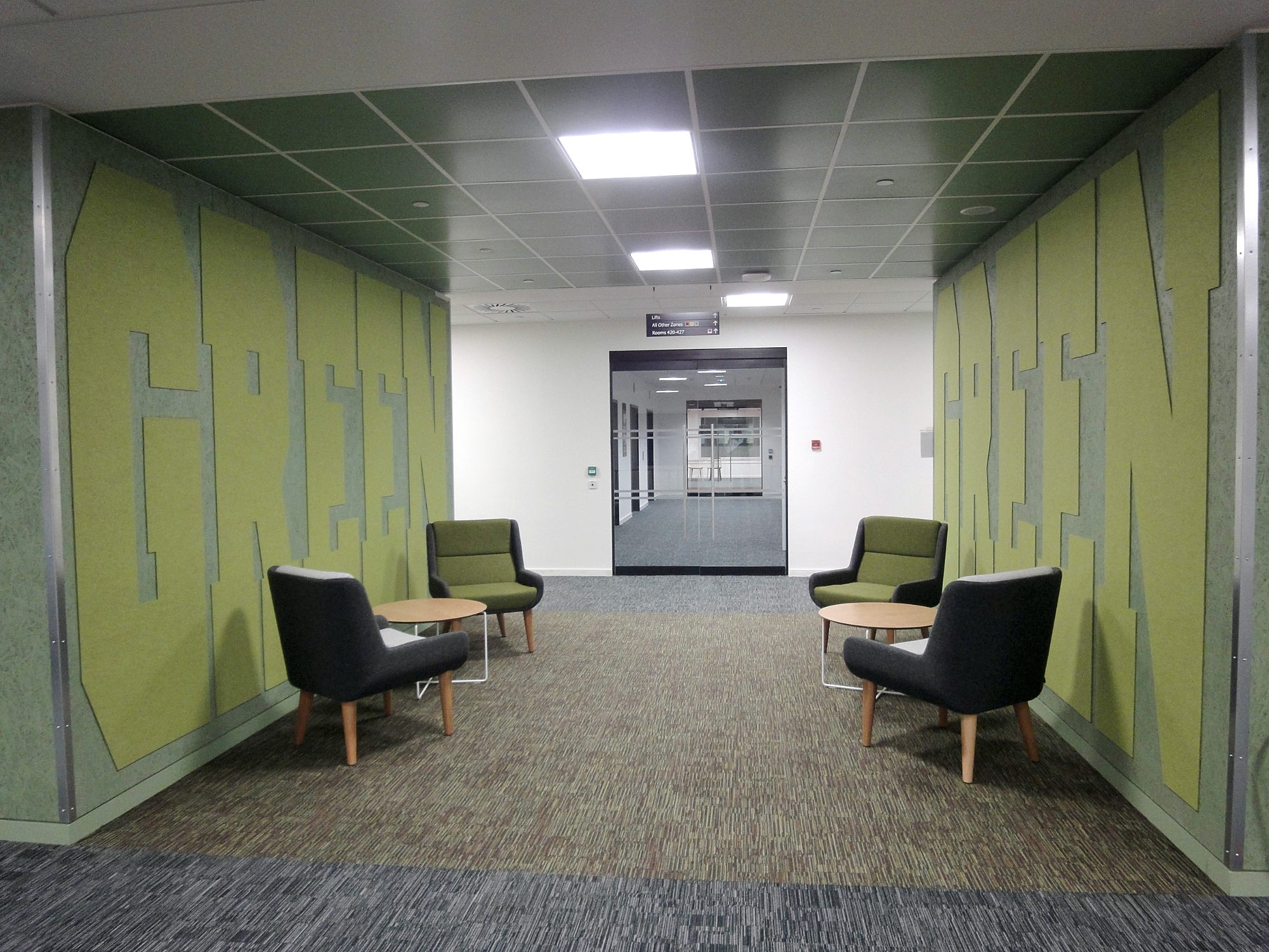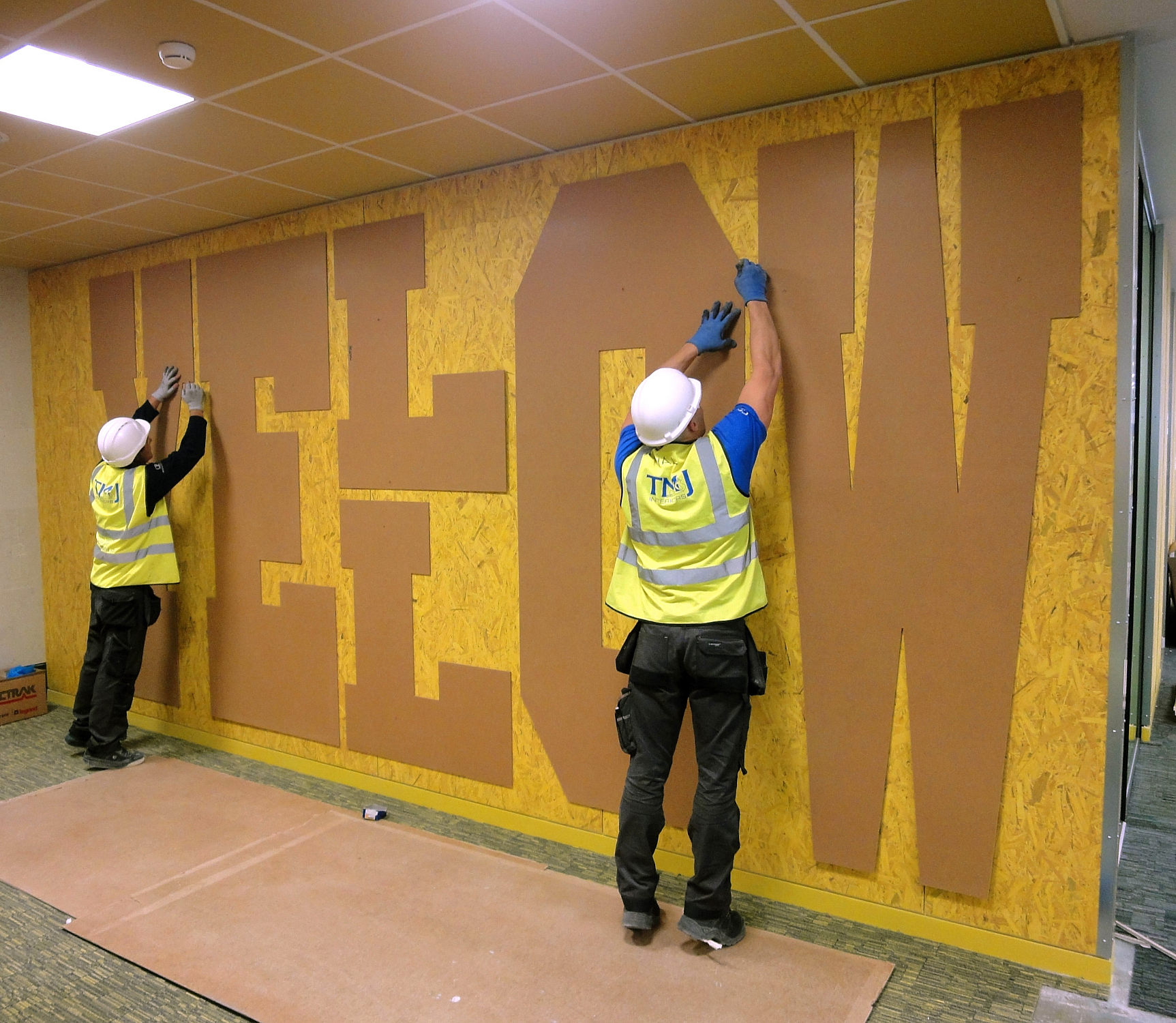 The letters are cut from polyester felt, applied to coloured OSB walls. |
